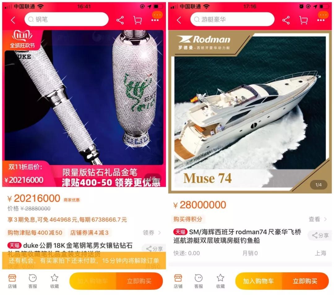 “2000多万的钻石金笔和2800万的豪华游艇是卖给谁的?”11月12日,有电商操盘手将两张高客单价商品的图片发到了朋友圈,并质疑了商品能否找到真实存在的买家。亿邦动力在天猫中搜索相关产品发现,这两样商品确实存在。所以,这些商品真的有人买吗?