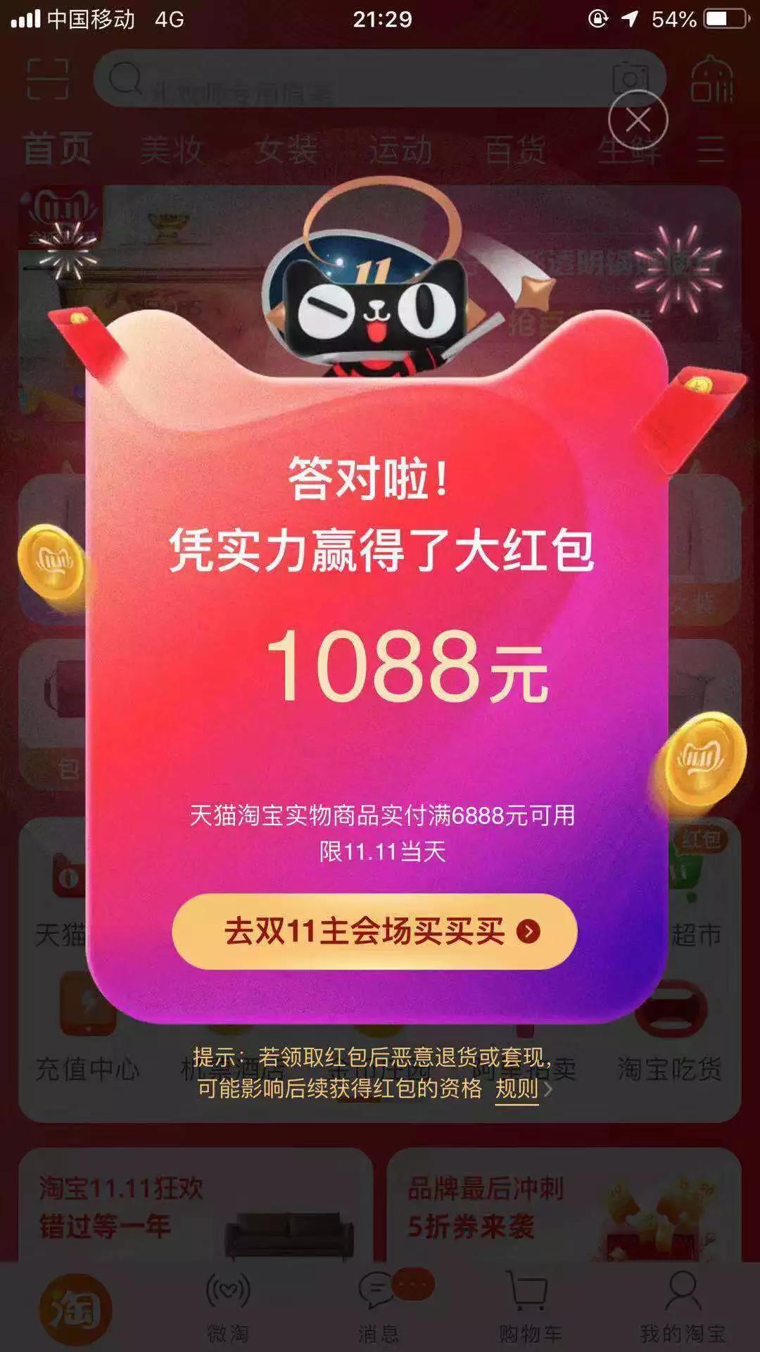 11月11日夜间,平台开始发放超大额优惠券辅助冲量。