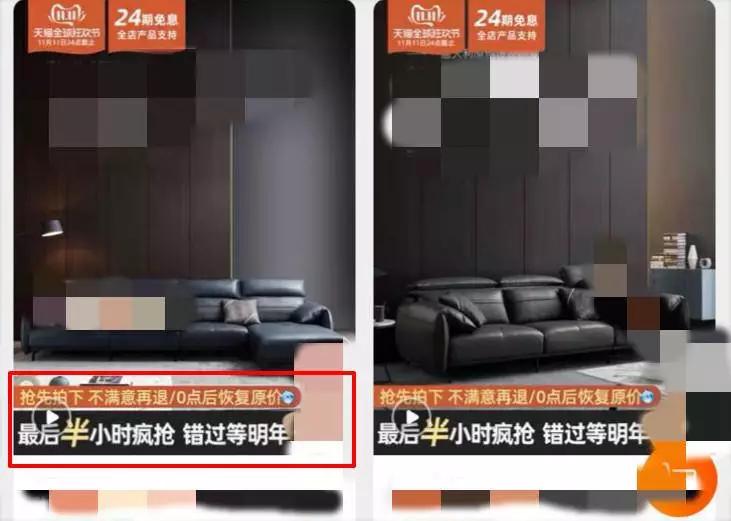 另一位剁手达人小明(化名)则告诉亿邦动力,自己在购买家具时曾被“拉着下单”。“商品页面直接就写着‘疯抢最后十分钟,错过等明年’,还用很显眼的方式鼓励消费者‘抢先拍下,不满意再退’。我以为这样的话只会出现在直播里。”此外,他还收到了另一个店铺客服鼓励下单抢占礼包,退款时无需退还礼包的“引诱”。