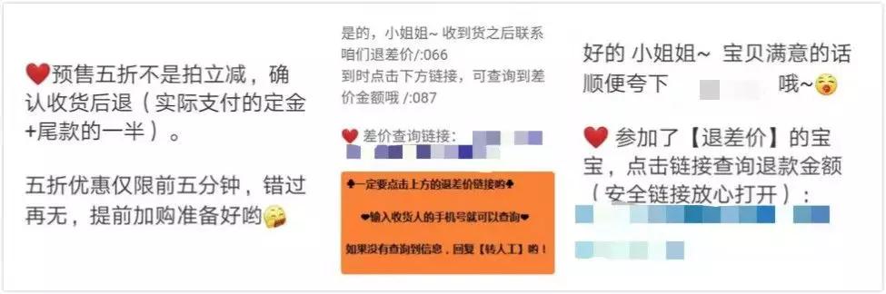 预售期间,消费者在支付每笔定金时,都必须勾选“定金不可单独退款”的平台协议,需完成尾款支付,才能整体申请退款;双11当天不予许退款,11月12日开始才能申请退款;双11当日最后几小时平台发放了超大额优惠券,且从预售起就倾注大量资源扶持的新流量渠道淘宝直播。